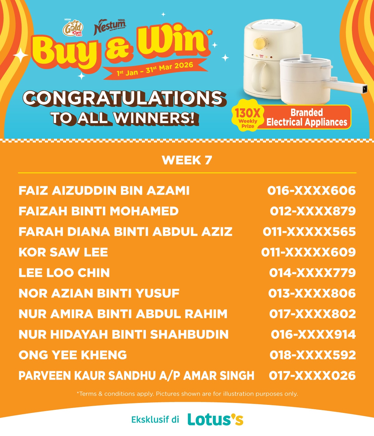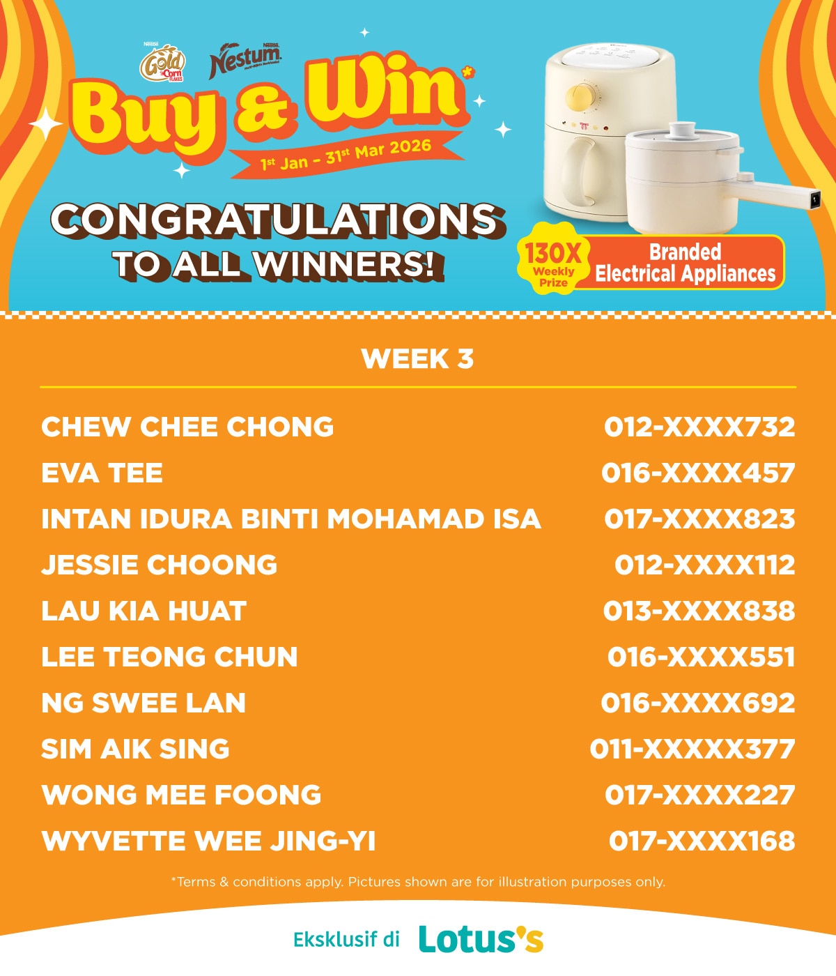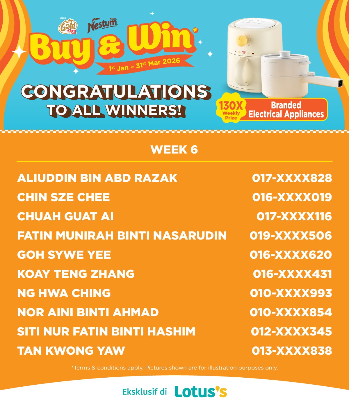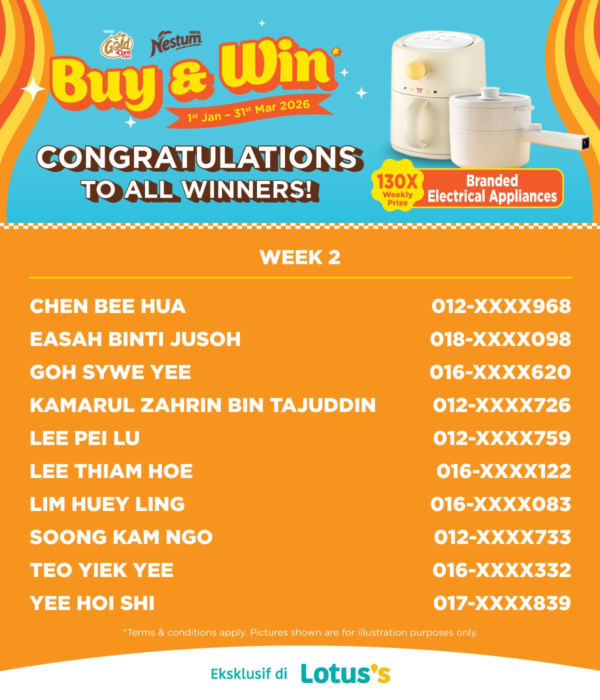 Buy any Nestum® or Cornflakes range products in a single receipt during the promotion period at any Lotus's outlets to enter the contest.